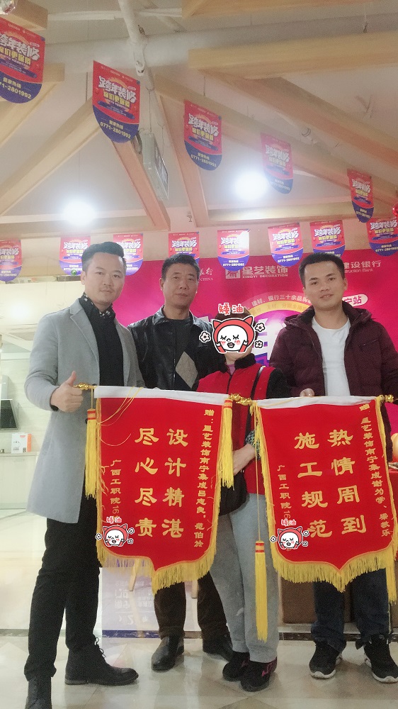 廣西工職院業(yè)主送來錦旗,稱贊設計師呂志良、范珀菸設計精湛,盡心盡責;監(jiān)理謝為學、梁敬樂熱情周到,施工規(guī)范。南寧星藝裝飾全員會繼續(xù)以虔誠、熱情、體貼的態(tài)度和更加務實、求精、利他的行動,將“讓每一位客戶滿意”的服務標桿,提升到“讓每一位客戶感動”的新高度,讓客戶省心、省時、省力!