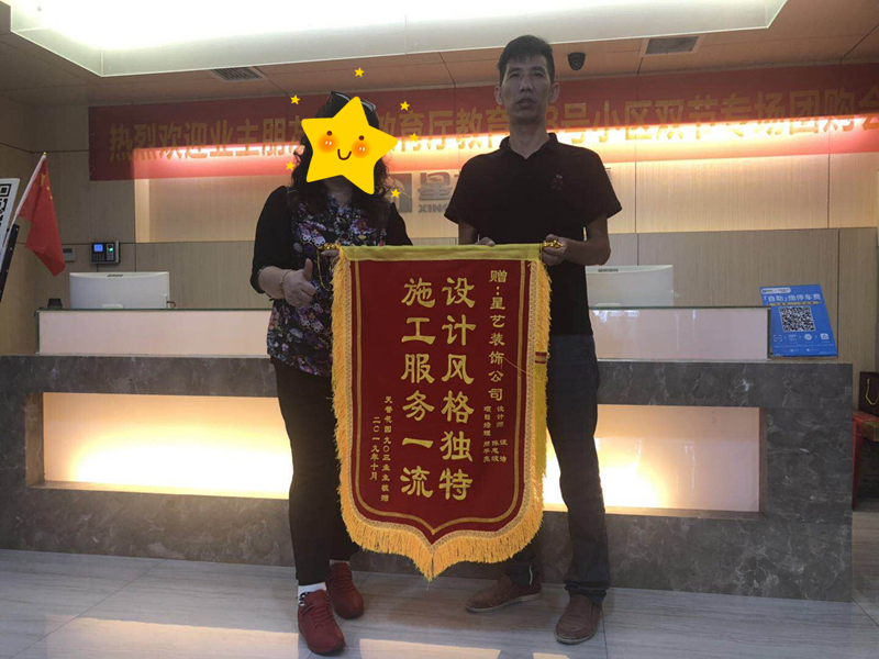 2019年10月,又一位天譽花園的業(yè)主送來錦旗,這是設計師陳忠波 項目監(jiān)理 周平亮近一個月收到的第二面錦旗,錦旗內容:施工服務一流 設計風格獨特