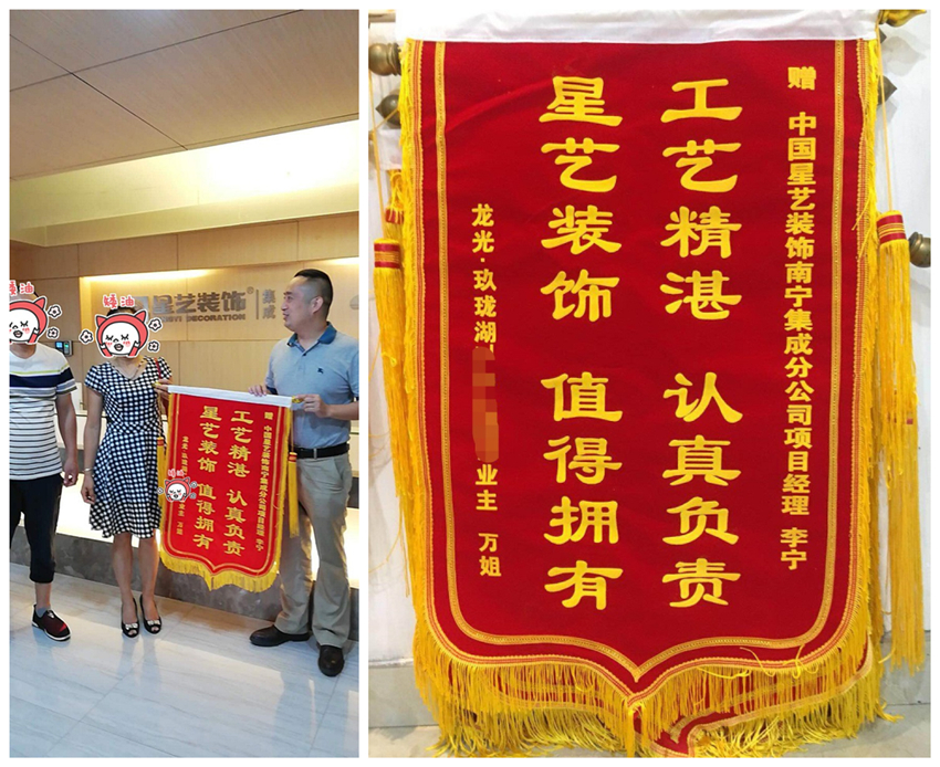 2018年9.月9日,龍光玖瓏湖業(yè)主送來錦旗,稱贊星藝裝飾項目經(jīng)理李寧,工藝精湛,認真負責,星藝裝飾,值得擁有