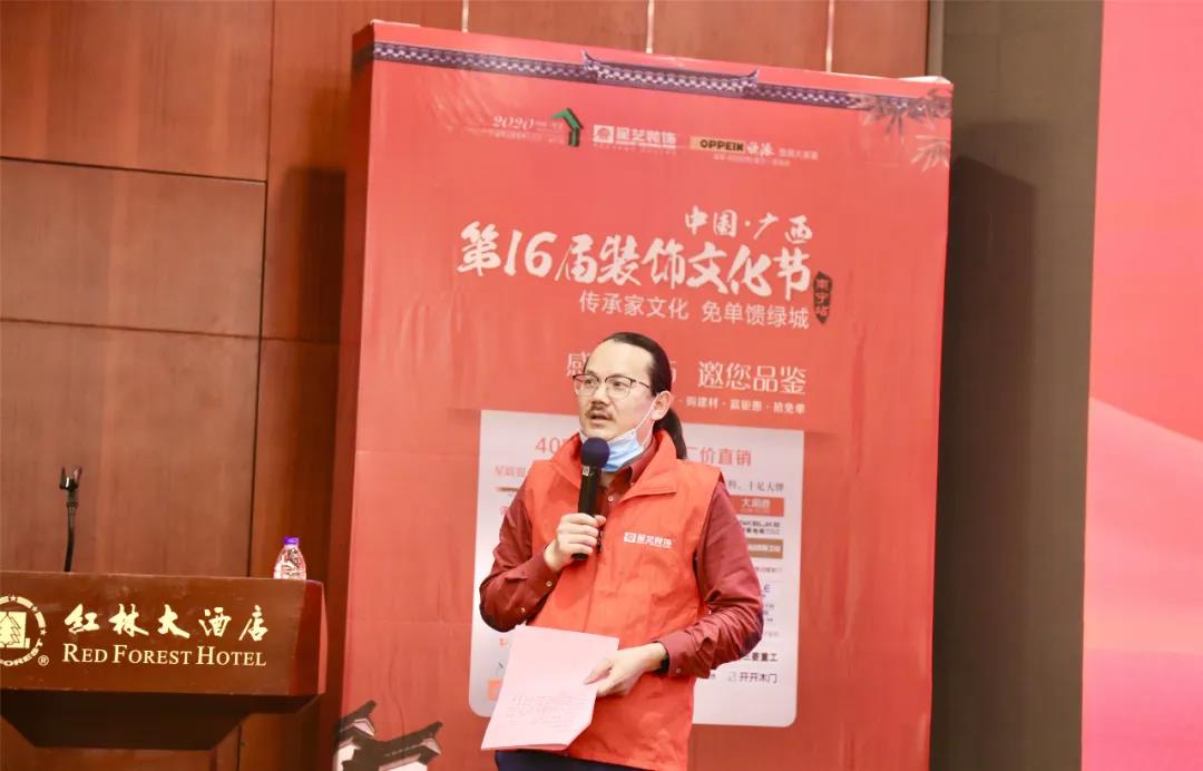 首先,星藝南寧區(qū)域設(shè)計(jì)總監(jiān)李明上臺講解第十六屆裝飾文化節(jié)(南寧站)的策劃方案、優(yōu)惠細(xì)則;李工結(jié)合2020年實(shí)際情況,仔細(xì)分析了活動方案上的每一處細(xì)節(jié),并不斷闡述2020年活動新的調(diào)整,以及活動新的推廣方式,現(xiàn)場展現(xiàn)了星藝在基于原有的基礎(chǔ)上,也在創(chuàng)新進(jìn)取,不斷強(qiáng)大,亦表明在本屆裝飾文化節(jié)中下足了“功夫”,希望每位星藝家人能借此良機(jī),取得更為耀眼的成績,再次刷新2019年的記錄。