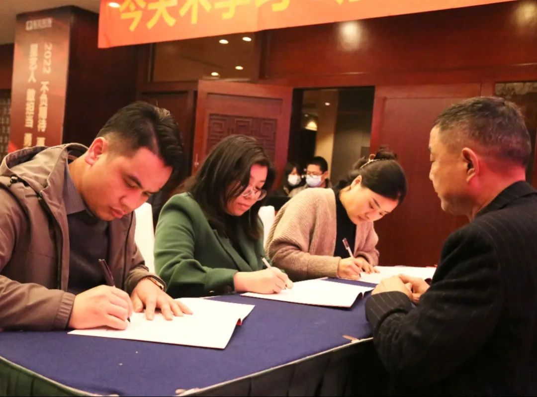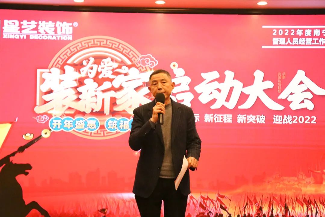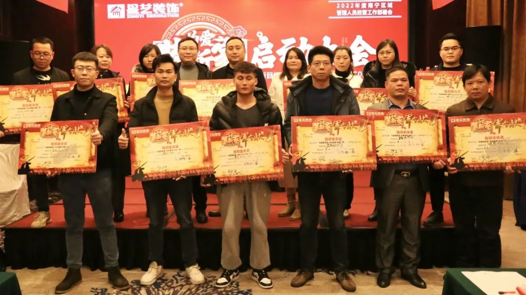 在啟動前,由星藝裝飾南寧區(qū)域設計總監(jiān)李明上臺回顧分析2021年星藝南寧所取得的成績,在同比前年數(shù)據(jù)、上游市場的變化,李工表示“星藝南寧業(yè)績能保持穩(wěn)定增長的局面實屬不易”,并強調“不止團隊管理者要創(chuàng)新,部門也必須創(chuàng)新”,隨后與各個部門負責人簽訂年度目標責任書、開年活動任務軍令狀。