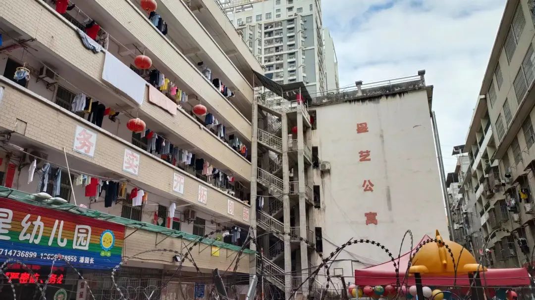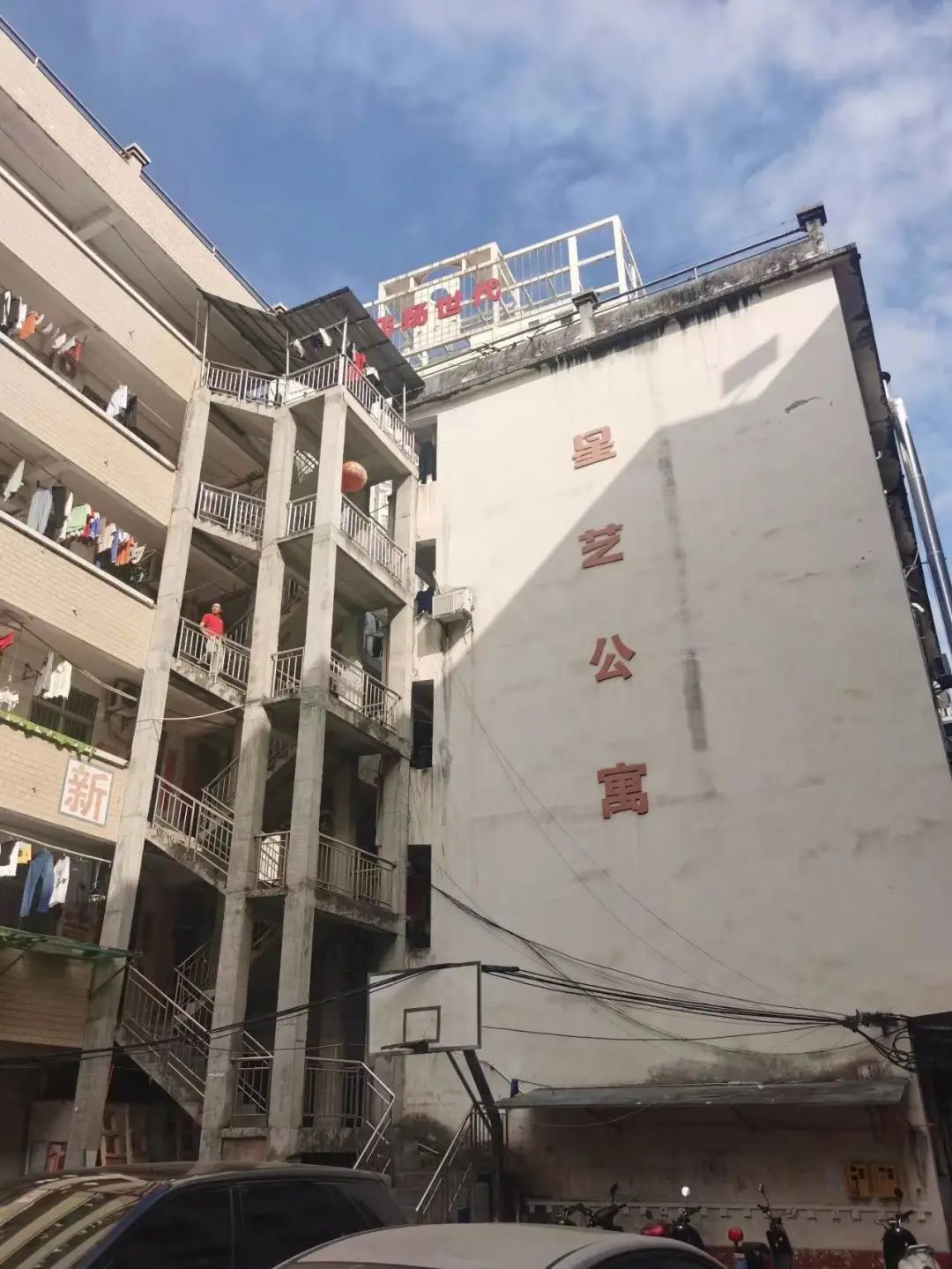 循童聲前往,見遠(yuǎn)處一棟樓的外墻上有“星藝公寓”4字。一樓幼兒園里孩子們的歡聲笑語與之相伴?!爸弊中卫鲜讲教葸B接兩棟樓,公寓樓總體呈“U”形合抱狀。公寓樓共5層,一樓設(shè)倉庫、食堂、工程部辦公室、材料部辦公室、財(cái)務(wù)辦公室、籃球場(現(xiàn)有一半被用作幼兒園)等,樓上則住人,居住者均為南寧星藝人及其家屬。