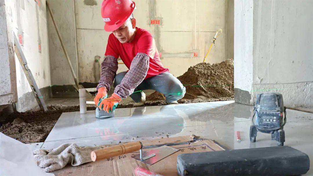 莫樹文以前鋪800毫米×800毫米的瓷磚,每天能鋪10平方米左右,現(xiàn)在鋪750毫米×1500毫米,一天依然只能鋪10平方米左右,因?yàn)楸仨毎阉俣确怕?,才能確保大磚鋪貼的質(zhì)量。其中一個鋪地磚的細(xì)節(jié)顯示,每塊大磚必須排版試鋪,再根據(jù)具體情況用干沙微調(diào)沙漿層,直至調(diào)平,然后才能正式上漿鋪貼。莫樹文說,如果不試鋪,直接用濕漿來找平,就容易因濕漿厚度不一、干燥速度不一樣而出現(xiàn)空鼓,圖省事或缺乏經(jīng)驗(yàn)的工人會省掉這個環(huán)節(jié)。