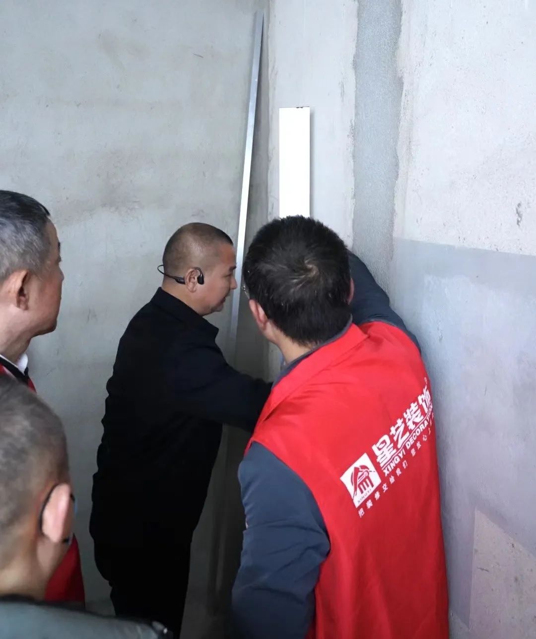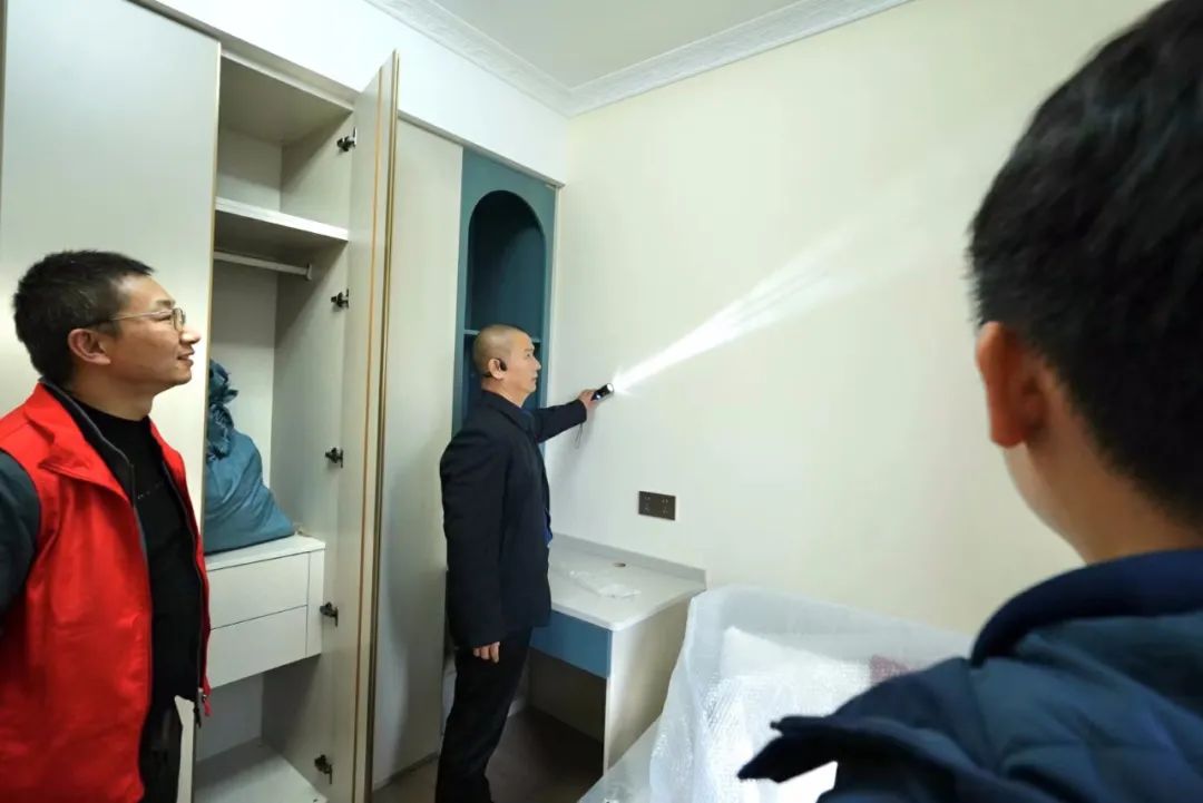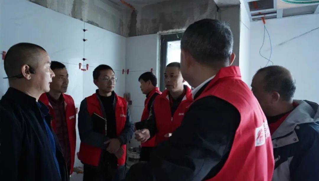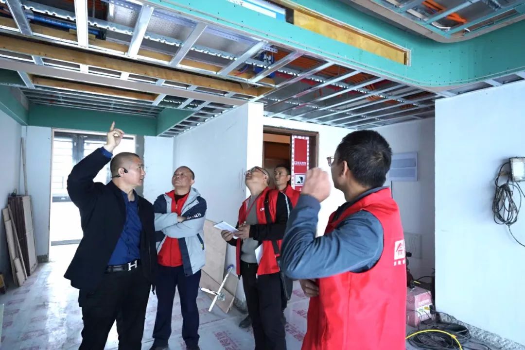 品質(zhì)大宅不僅需要精心設(shè)計、合理規(guī)劃空間布局,更需要高品質(zhì)的施工,在現(xiàn)場,工藝標準經(jīng)驗豐富的張總與現(xiàn)場監(jiān)理、質(zhì)檢以及施工師傅搭手實操交流,墻面找平膩子技巧、門口的收邊工藝、輕鋼骨工藝驗收、水電鋪設(shè)、板材進場、衛(wèi)生間廚房貼磚……事無巨細,對每道施工工序改進、提升都給出了實用可行的建議。