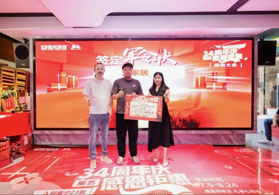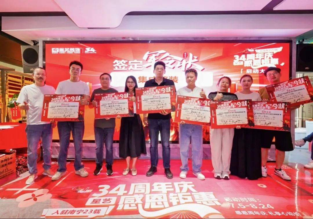隨著現(xiàn)場氣氛逐漸高漲,會議進入星藝集團34周年慶活動啟動環(huán)節(jié),星藝南寧門店負責人、設(shè)計師、經(jīng)理等紛紛與周總、李工、胡總簽訂“軍令狀”,誓既出,必達成,新的征途正式啟動。